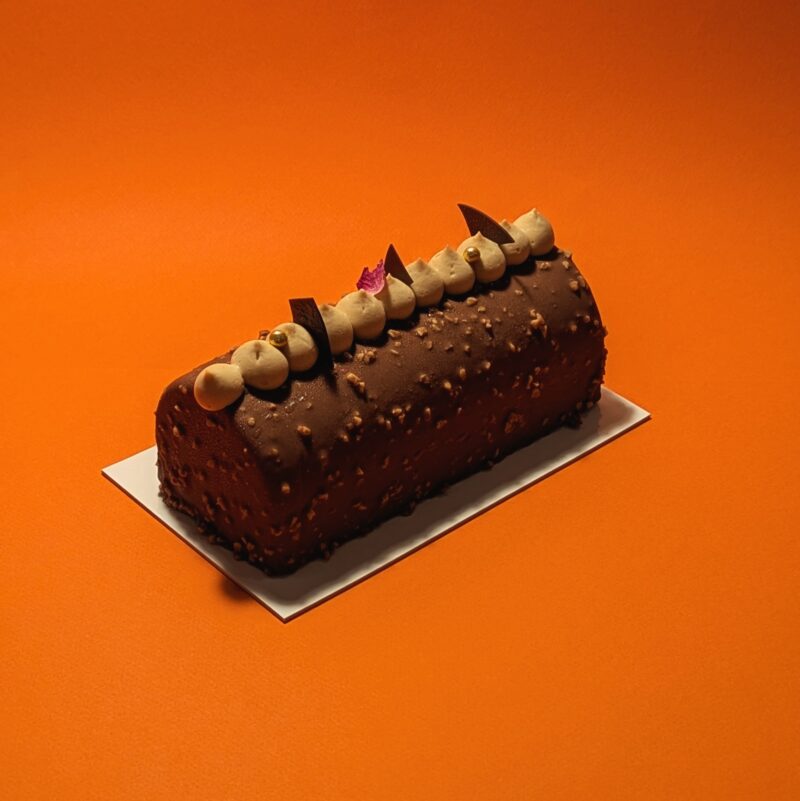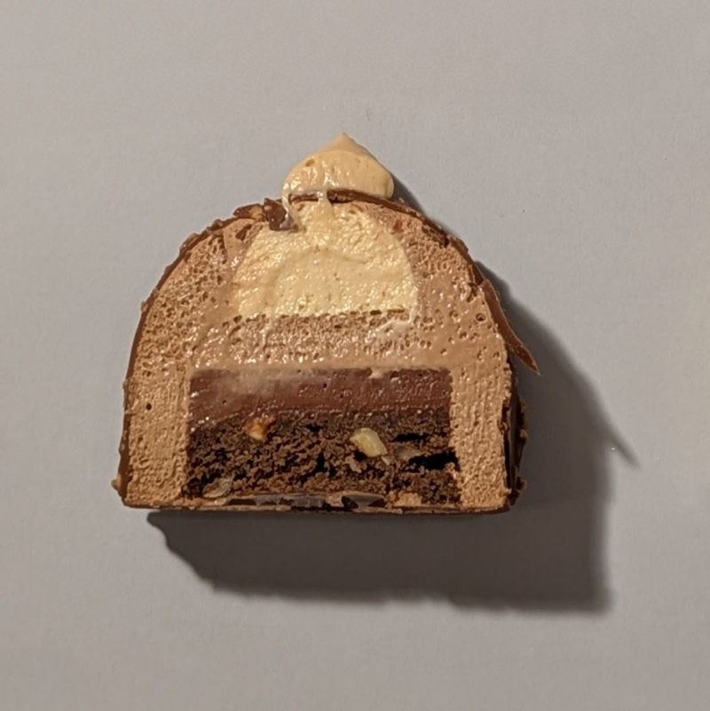 Mousse chocolat au lait, crémeux chocolat 70% origine Venezuela infusé au Hojicha (thé vert du Japon torréfié), crémeux noisette du Piémont, brownie noisette.