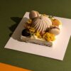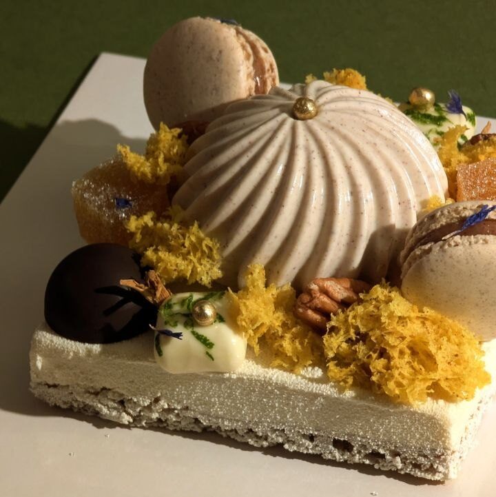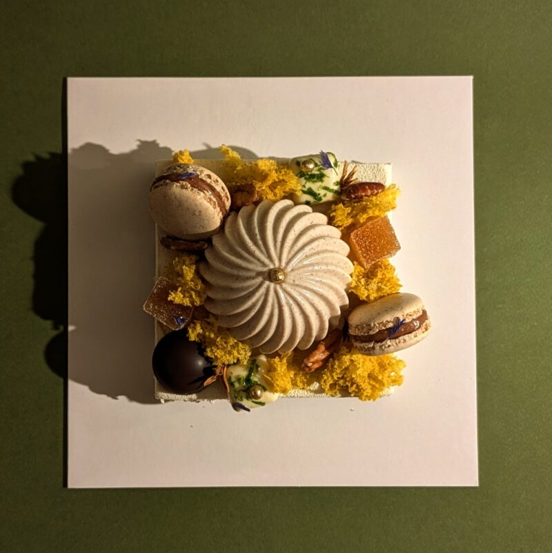 Panacotta noix de pécan, crème aux agrumes fruit de la passion et yuzu, pâte de fruit gingembre, macaron pécan, petite douceur coco, chocolat fourré gelée fruit de la passion… Et d’autres notes cachées qui attendent votre découverte.